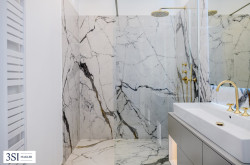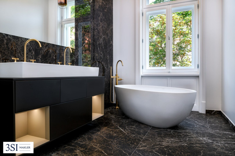 - Exklusive Bäder mit freistehender Badewanne, Doppelwaschtischen, Markenarmaturen und Marmoroptik-Feinsteinzeug