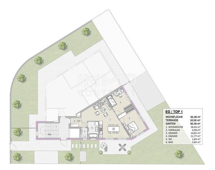 Top 1 begeistert mit einer außergewöhnlich großzügigen Freifläche: Starten Sie den Tag mit Sonne und frischer Morgenluft auf der ca. 50 m² großen Terrasse und im privaten Garten mit ca. 94 m². Die rund 66 m² Wohnfläche überzeugen durch einen offenen Wohn- und Essbereich mit direktem Zugang ins Freie. Zwei vielseitig nutzbare Schlafzimmer – jeweils mit Ausgang zu Terrasse und Garten – eignen sich ideal als Schlaf-, Kinder- oder Arbeitszimmer. Ein Badezimmer mit Blick ins Grüne sowie ein separates WC runden dieses besondere Wohnangebot perfekt ab – perfekt für Pärchen und Kleinfamilien.