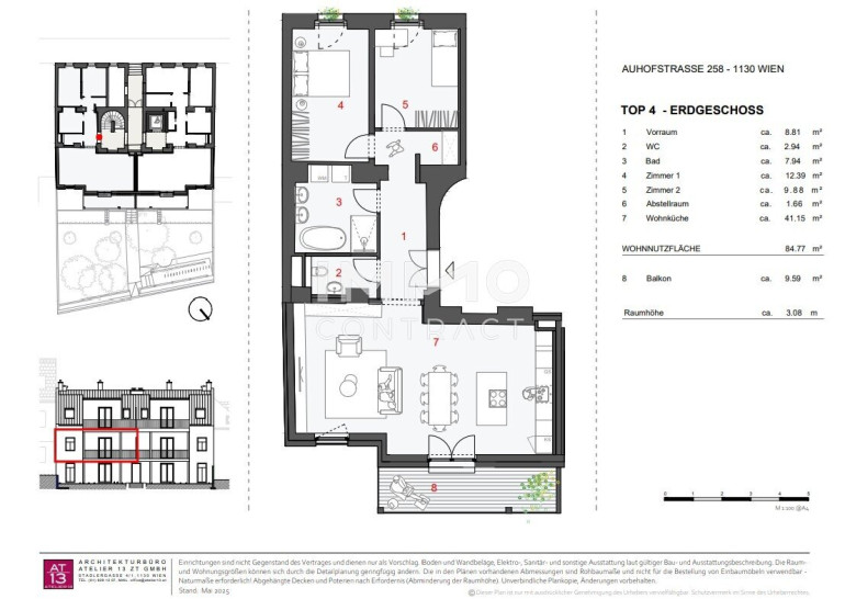 Die Ausstattung folgt einem klaren Qualitätsanspruch: Eichenparkett in Fischgrätverlegung, elegante Sanitärausstattung, Fußbodenheizung mit Einzelraumregelung, Personenaufzug, Videogegensprechanlage, Zentralsperranlage sowie hochwertig gestaltete Allgemeinbereiche mit Alt-Wien-Charakter. Großzügige Außenflächen, Fahrrad- und Nebenräume sowie professionell ausgeführte Gemeinschaftszonen unterstreichen den Premiumanspruch des Hauses.