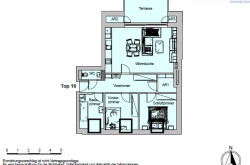 Die im DG befindliche Mietwohnung weist eine Gesamtnutzfläche von ca. 72,25 m² auf und gliedert sich wie folgt: Vorraum, zwei Schlafzimmer, Wohnküche, Badezimmer, Terrasse, Abstellraum und WC.
