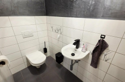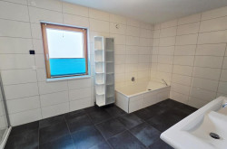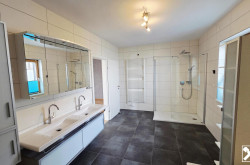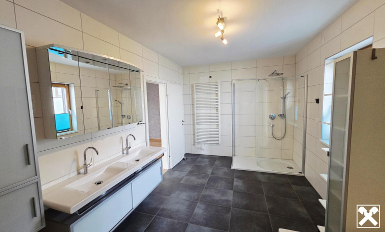 - großzügiges Badezimmer mit Dusche, Badewanne, Doppelwaschbecken und Waschmaschinenanschluss