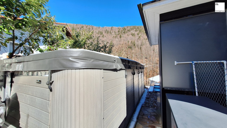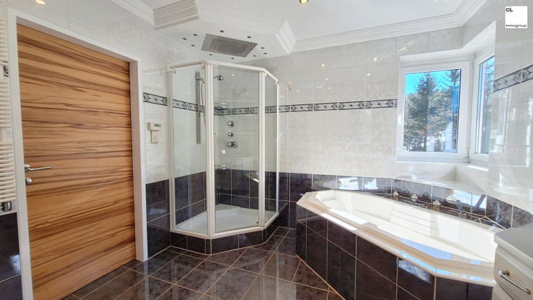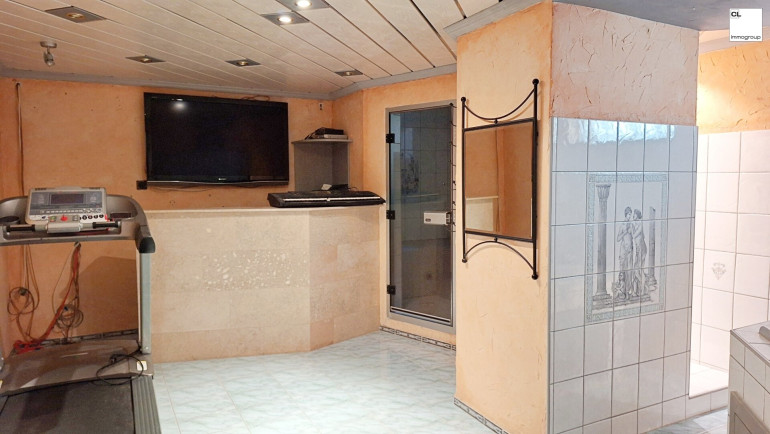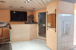 Von hier aus erreicht man über eine kleine Stiege auch die Wellnessoase im Untergeschoss. Für Ihr persönliches Wohlbefinden ist eine Sauna und eine Infrarotkabine vorhanden. In einem weiteren Raum befindet sich ein Whirlpool, ein Dampfbad und eine extra Dusche. Die Räume sind vielseitig nutzbar, ob als Fitnessinsel oder Partykeller, alles ist möglich und im Winter besonders angenehm. In den wärmeren Monaten bietet der Garten mit großen Terrassenflächen, nahezu uneinsehbar, ein privates Paradies mit Pool (noch zum Fertigstellen) und einem beheizbaren SWIMSPA mit Gegenstromanlage und einer Außendusche. Der Feierabend lässt sich mit der vorhandenen Grillstelle besonders genießen. Falls sich die neuen Bewohner lieber eine Rasenfläche anstatt des Pools wünschen, wird dies auf Kosten der Eigentümer umgesetzt.