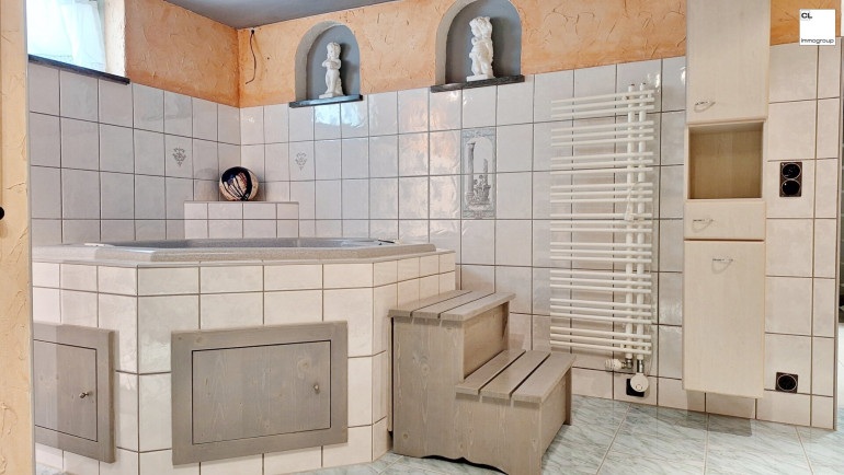 Fliesen, Laminatboden, Fußbodenheizung, Kamin, Einbauküche, Bad mit Fenster, Badewanne, Dusche, Kabel/Satelliten-TV, Garage, Carport, Sauna, Swimmingpool