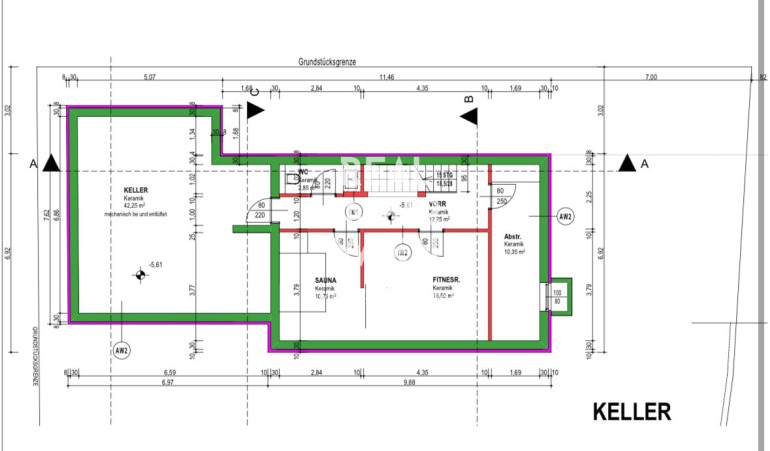 Keller: Ein Vorraum, zwei vielseitig nutzbare Räume, einer davon für eine Sauna geeignet, ein weiteres WC und Abstellmöglichkeiten.