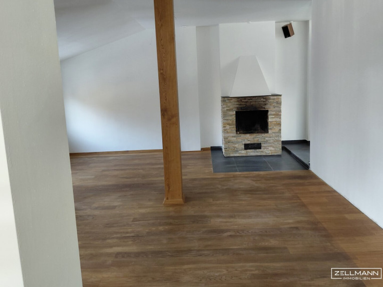 Offener Wohnbereich mit Kamin & Holzbalken