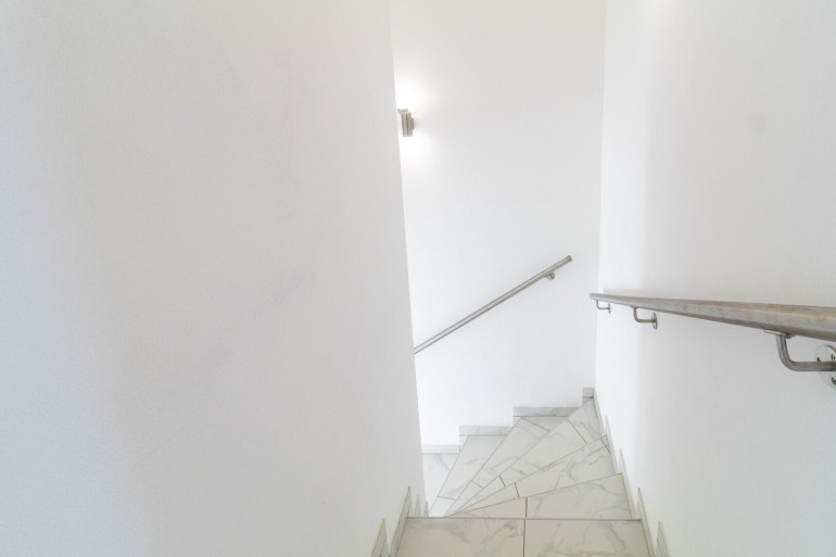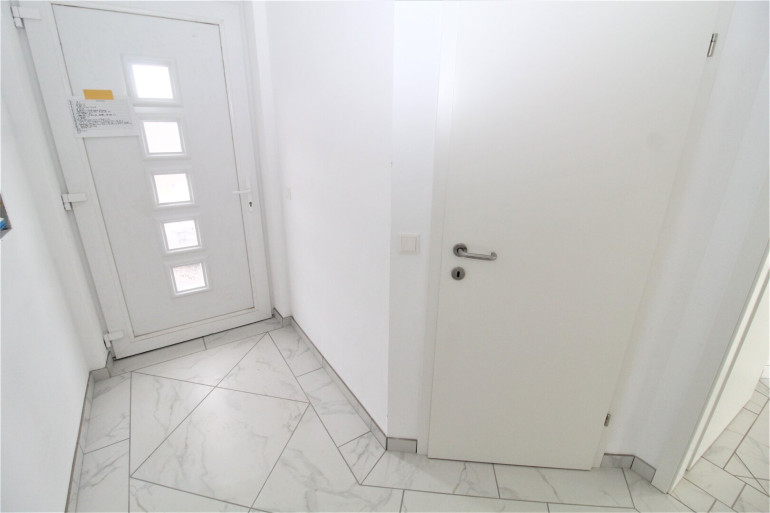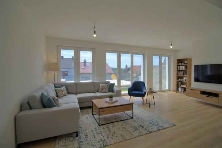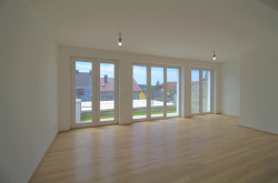 Die Nassräume sind mit, Badewanne, Dusche, Waschbecken, Spiegel- und Unteraschrank und Waschmaschinenanschluss ausgestattet. Am Boden und an den Wänden wurden große Fliesen verlegt. Die Bodenbeläge im Wohnbereich und in den Zimmern sind aus hochwertigem Laminat. Die weißen Innentüren und Türstöcke sind ebenfalls eingebaut.