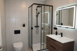 Das Badezimmer ist mit Dusche, WC, Waschmaschinenanschluss und einem Waschbecken ausgestattet.