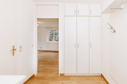 Das Badezimmer ist modern und zeitlos gestaltet und verfügt über eine Dusche. Ein Waschmaschinenanschluss ist vorbereitet. Alternativ steht den Bewohner:innen ein gemeinschaftlicher Waschraum im Keller mit Waschmaschine und Trockner zur Verfügung.