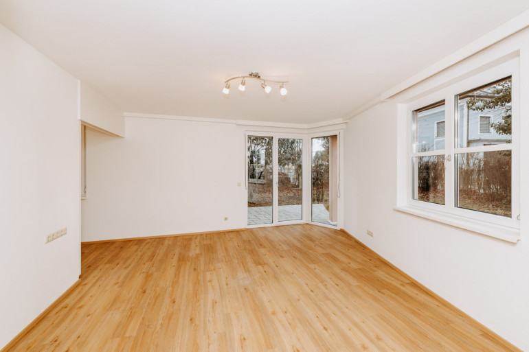 Die Wohnung befindet sich im Erdgeschoss und überzeugt durch einen großzügigen, offenen Wohn-Essbereich, in den eine praktische Schlafnische integriert ist. Diese Raumlösung schafft ein angenehmes Wohngefühl bei klarer Zonierung von Wohnen und Schlafen. Vom Wohnbereich aus gelangt man direkt in den Garten, der den Wohnraum ins Freie erweitert und einen echten Mehrwert bietet.