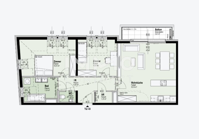 Fliesen, Parkett, Fußbodenheizung, Personenaufzug, Westbalkon, Bad mit Fenster, Badewanne