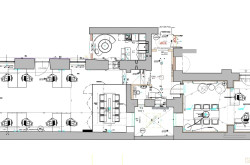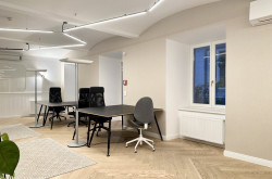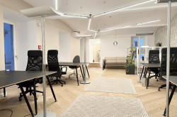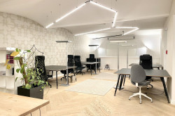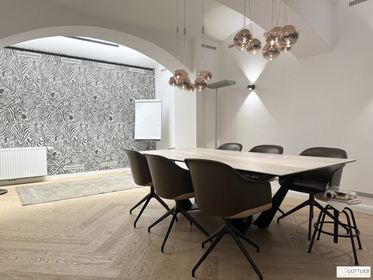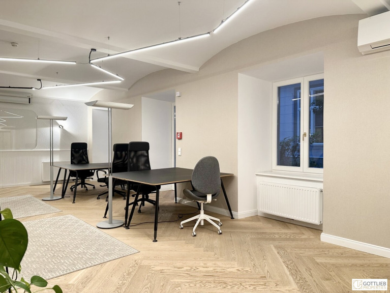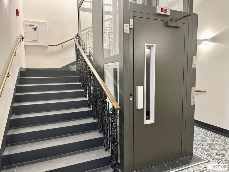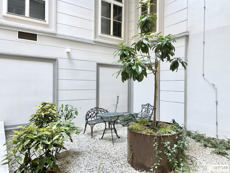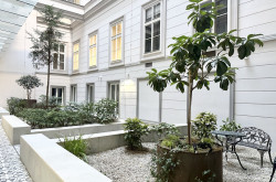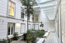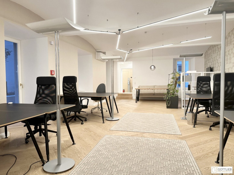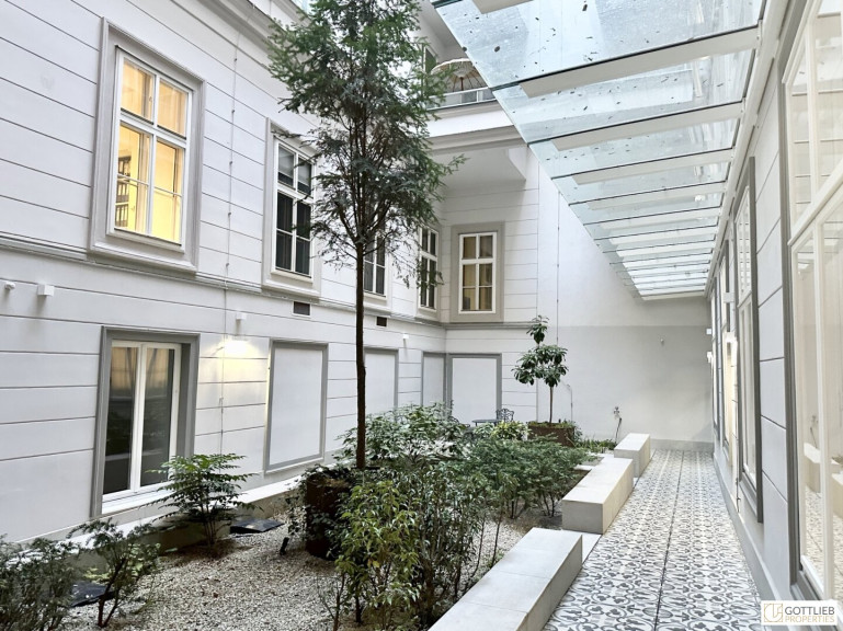 Das Büro befindet sich im Erdgeschoss in den ruhigen Innenhof gerichtet und beinhaltet zwei getrennt begehbare Bürozimmer inklusive Besprechungsraum, eine Küche, eine Toilette sowie eine kleine Terrasse. Der Innenhof ist direkt vom loftartigen Bürozimmer aus begehbar.