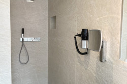 + Bad mit maßgefertigter Dusche, Badewanne, Doppelwaschbecken mit Unterschrank und beleuchtetem Spiegel