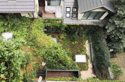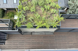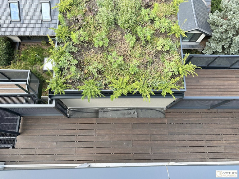 Über eine Treppe oder den Heimlift erreicht man die weitläufige, ebenfalls bereits begrünte Dachterrasse, ausgestattet mit einem Sonnensegel und einem exklusiven Outdoor-Pool mit Gegenstrom-Anlage.