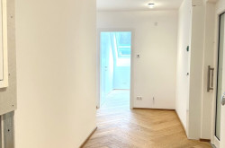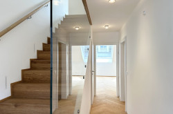 Man betritt die Wohnung über den Vorraum und gelangt von hier aus zentral in die drei Schlafzimmer, ein Wellness-Tageslicht-Bad, ein weiteres Bad, die zwei separaten Toiletten mit Handwaschbecken sowie auf den hofseitigen Balkon. Mit dem Heimlift oder über den geräumigen Treppenaufgang erreicht man sowohl das Obergeschoss als auch die Dachterrasse.