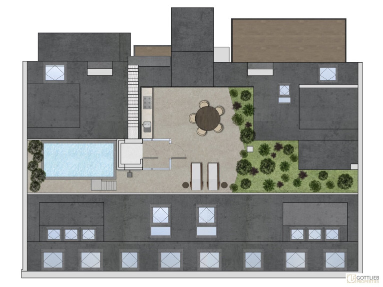 Zum sofortigen Verkauf gelangt eine luxuriöse ca. 210 m² große, lichtdurchflutete Dachterrassen-Wohnung mit eigenem Heimaufzug, einem ca. 10 m² Balkon, einer ca. 5 m² hofseitigen Terrasse, einer ca. 8 m² hofseitigen Terrasse sowie einer ca. 68 m² großen Dachterrasse mit Outdoor-Pool in einem historischen Gebäude. Der dreigeschossige Dachausbau wurde soeben fertiggestellt.