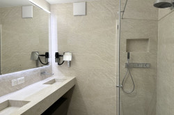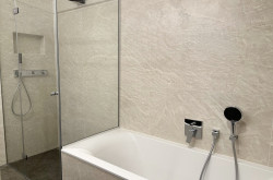 + Bad mit maßgefertigter Dusche, Badewanne, Doppelwaschbecken mit Unterschrank und beleuchtetem Spiegel