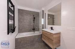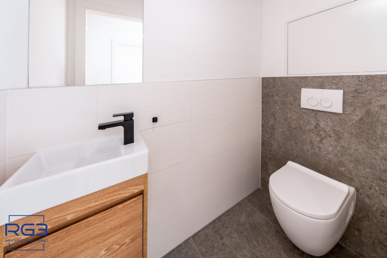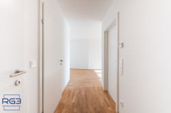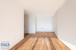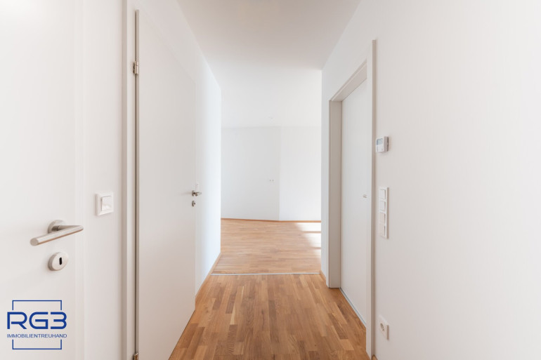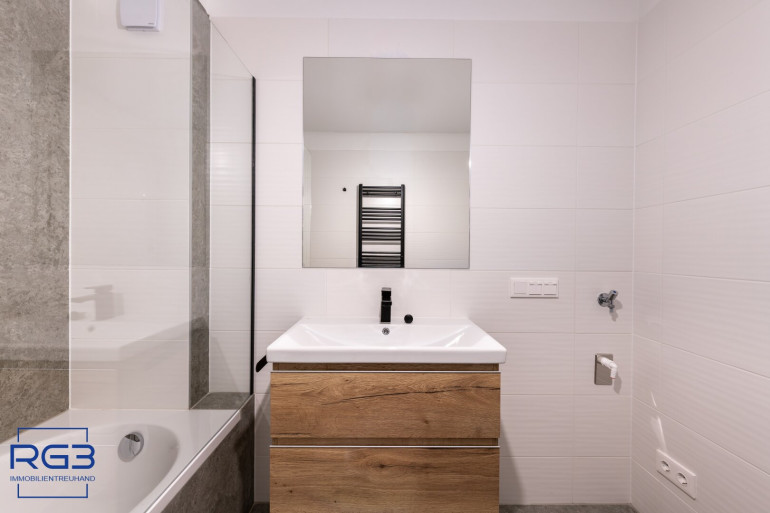 Mit dem Lift fahren Sie bequem in den ersten Stock. Sie betreten die Wohnung und spüren sofort: alles ist neu, alles ist ruhig, alles passt zusammen. Rechts befindet sich ausreichend Platz für Garderobe und Jacken. Links liegt das moderne Badezimmer mit extra Toilette, klar gestaltet, hochwertig ausgeführt.