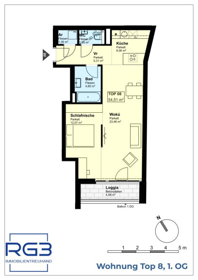 Diese Top Immobilie befindet sich in der 1. Etage und hat eine Wohnfläche von ca. 54,51 m². Sie hat einen Abstellraum und einen Kellerraum, der mit dem Lift erreichbar ist.