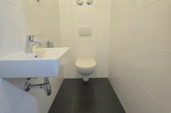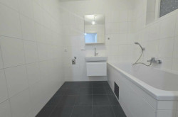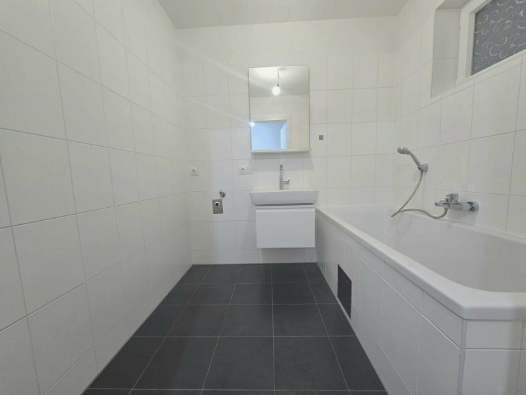 Das Badezimmer ist mit einer Wanne und einem Waschmaschinenanschluss ausgestattet, während das WC separat ist.