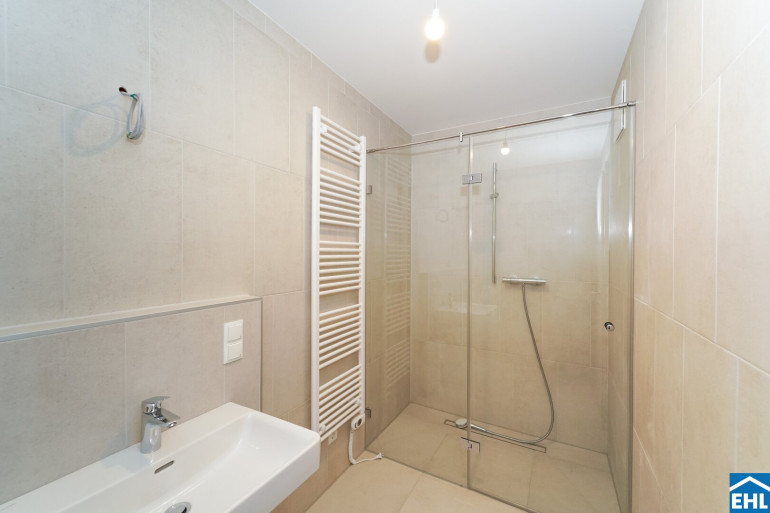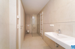 - Großformatige Feinsteinzeugfliesen in den Nassräumen