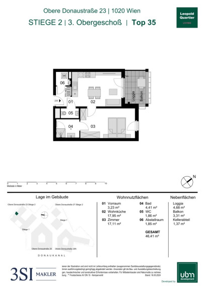 Diese moderne Wohnung befindet sich im 3. Obergeschoß. Die Einheit verfügt über eine Wohnnutzfläche von insgesamt 46,41 m² und bietet zusätzlich einen ca. 4,68 m² Loggia und 3,31 m² großen Balkon.