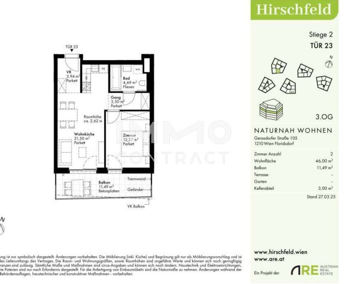 Naturnah und gut angebunden Hirschfeld ist ein beschauliches Viertel am Wiener Stadtrand. Die Metropole im Rücken verheißt jedem Nachhausekommen ein Naturerlebnis und Entspannung. Wer gerne mit den Wiener Linien unterwegs ist, nimmt am besten die Autobuslinie 32A ab Kollarzgasse bis zum U- und S-Bahn-Knotenpunkt Leopoldau. Von hier aus ermöglichen die U1 in Richtung Zentrum sowie die Schnellbahnlinien S1, S2 und S7 eine rasche Verbindung stadtein- und stadtauswärts. Alternativ verläuft die Straßenbahnlinie 31 entlang der Brünner Straße über Floridsdorf direkt bis Schottenring. Autofahrer profitieren von der nahegelegenen A22.Beschreibung der Immobilie