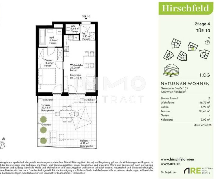 Naturnah und gut angebunden Hirschfeld ist ein beschauliches Viertel am Wiener Stadtrand. Die Metropole im Rücken verheißt jedem Nachhausekommen ein Naturerlebnis und Entspannung. Wer gerne mit den Wiener Linien unterwegs ist, nimmt am besten die Autobuslinie 32A ab Kollarzgasse bis zum U- und S-Bahn-Knotenpunkt Leopoldau. Von hier aus ermöglichen die U1 in Richtung Zentrum sowie die Schnellbahnlinien S1, S2 und S7 eine rasche Verbindung stadtein- und stadtauswärts. Alternativ verläuft die Straßenbahnlinie 31 entlang der Brünner Straße über Floridsdorf direkt bis Schottenring. Autofahrer profitieren von der nahegelegenen A22.Beschreibung der Immobilie