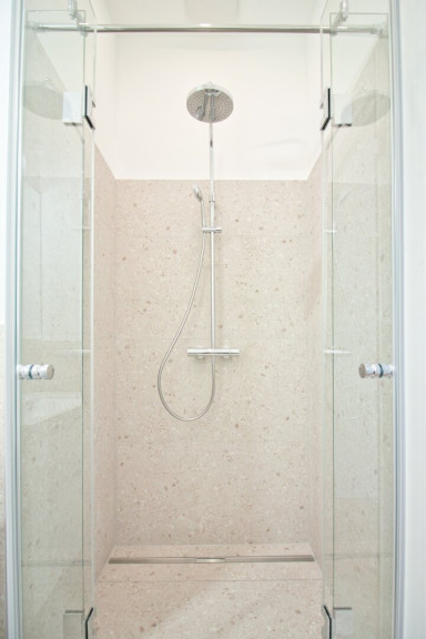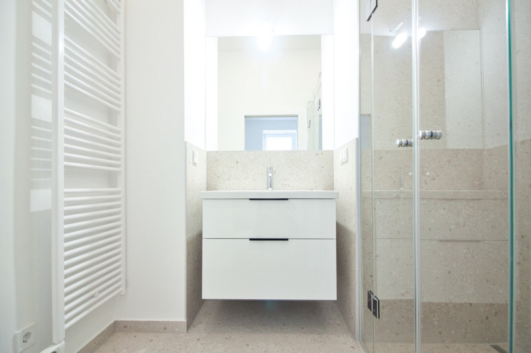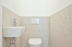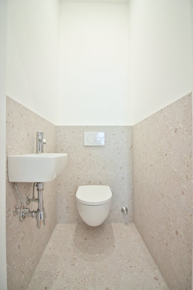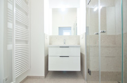 Der großzügige Vorraum bietet ausreichend Platz für Garderobe, die Gastherme und für eine Waschmaschine. Direkt neben dem Eingang befindet sich ein separates WC mit Handwaschbecken. Das ostseitige Schlafzimmer verfügt über ein Badezimmer-en-suite mit bodengleicher Regenwalddusche, Waschtisch mit Unterschrank und einem elektrischen Handtuchheizkörper, das über eine elegante Schiebetüre zugänglich ist.
