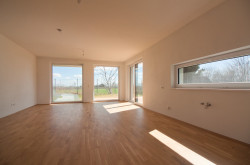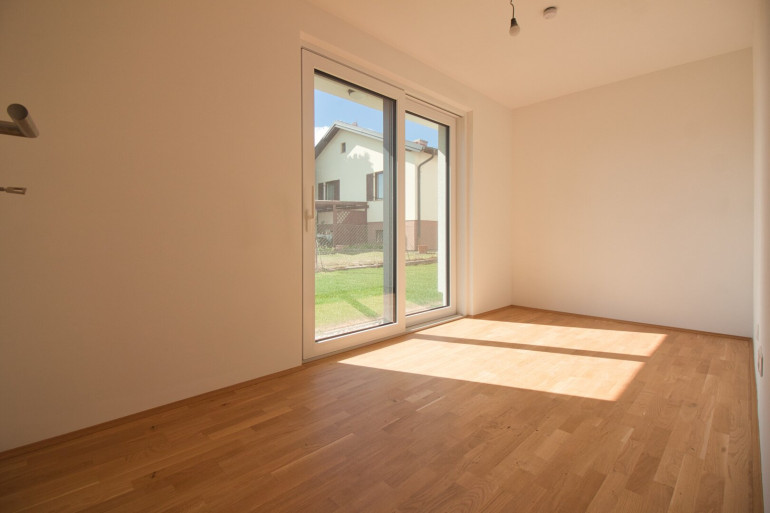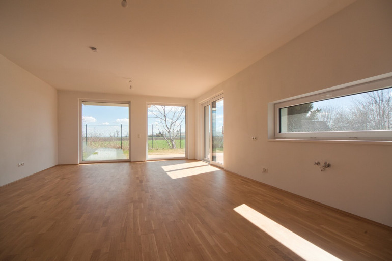 Beim Betreten des Hauses gelangen Sie in einen offenen Vorraum. Gleich linker Hand befindet sich ein separates WC mit Handwaschbecken, rechts ein ca. 11 m² großes Zimmer mit Blick ins Grüne. Der lichtdurchflutete Wohnbereich (ca. 36 m²) bietet reichlich Platz für eine großzügige Küche und ein einladendes Wohnzimmer. Zwei Fixverglasungen und eine Schiebetüre lassen viel Tageslicht herein und verbinden das Innere mit dem Außenbereich. Von hier aus geht es auf die ca. 25 m² große Terrasse und weiter in den rund 168 m² großen, sonnigen Garten – perfekt zum Entspannen oder Garteln.