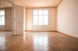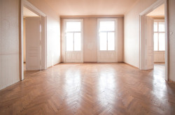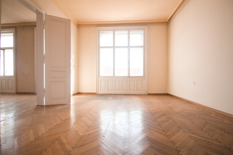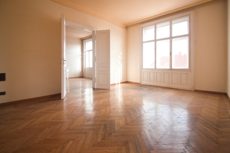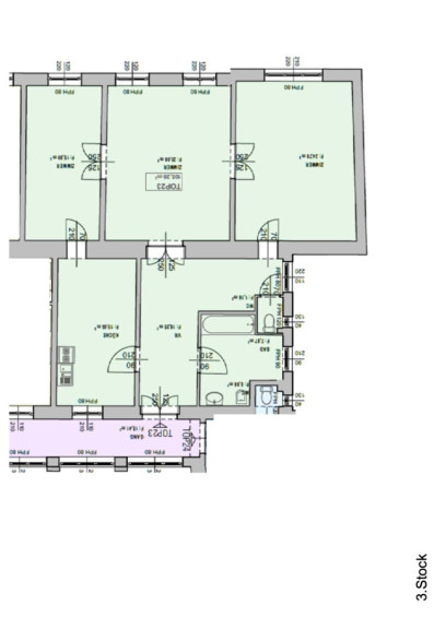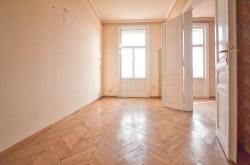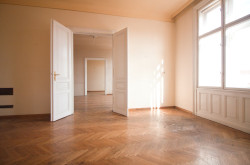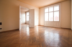 Rechter Hand beim Eingang befindet sich das Badezimmer mit Badewanne, Waschtisch und einem Bidet. Linker Hand ist die separate, ca. 15 m² große Küche mit Platz für einen gemütlichen Essbereich untergebracht. Der L-förmige Vorraum endet in einer separaten Toilette und erschließt 2 der 3 großen und gut geschnittenen, hellen Zimmer. Die beiden direkt begehbaren Zimmer sind ca. 25 m² groß, das dritte Zimmer, welches über das Wohnzimmer erreichbar ist, ca. 15 m².