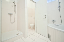 - Badezimmer mit Badewanne, Dusche, 2 Waschtischen und Waschmaschinenanschluss