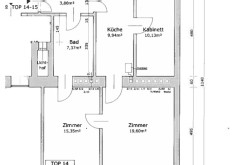 Gehen wir durch die Küche, betreten wir zwei südseitige Räume in Richtung Geiselbergstraße. Diese haben ca. 20 m2 und 15 m2 und eignen sich ideal als Wohn- und Schlafzimmer.
