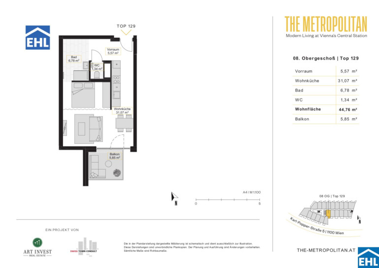 Das moderne Wohnbauprojekt „METROPOLITAN – Modern Living“ befindet sich im aufstrebenden und lebendigen Sonnwendviertel, nur wenige Gehminuten vom neu errichteten Hauptbahnhof entfernt. Die Lage bietet eine hervorragende Infrastruktur mit zahlreichen Einkaufsmöglichkeiten, Restaurants und Cafés in der Umgebung. Besonders hervorzuheben ist die Nähe zum Helmut-Zilk-Park, der Erholung und Freizeitspaß für die ganze Familie bietet.