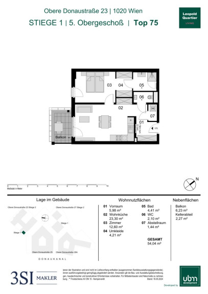 Diese moderne Wohnung befindet sich im 5. Obergeschoß. Die Einheit verfügt über eine Wohnnutzfläche von insgesamt 54,41 m² und bietet zusätzlich einen ca.6,23 m² großen Balkon.