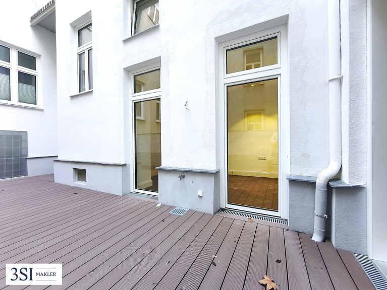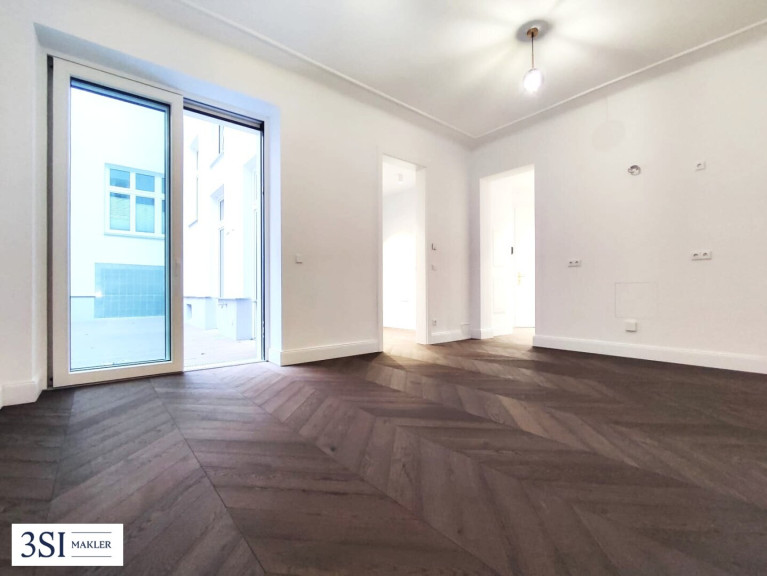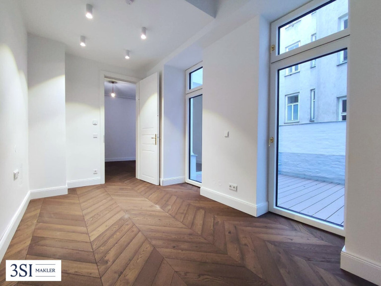 Die Wohnung liegt im Erdgeschoss und ist in zwei Innenhöfe ausgerichtet. Der private Außenbereich ist direkt über die Wohnküche und das Schlafzimmer zugänglich.