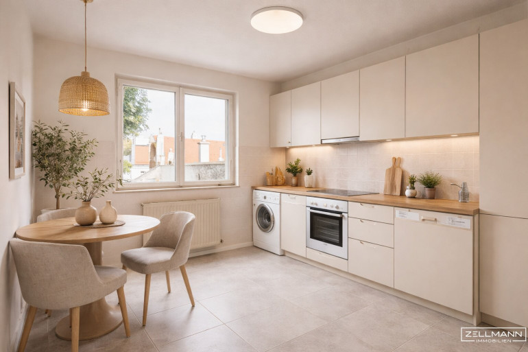 Die derzeit präsentierten möblierten Bilder zeigen mögliche Wohnsituationen nach einer Renovierung. Diese Darstellungen basieren auf den originalen Räumlichkeiten der Wohnung und wurden mittels KI-gestützter Visualisierung erstellt, um ein mögliches zukünftiges Wohnerlebnis nach einer Modernisierung zu veranschaulichen.