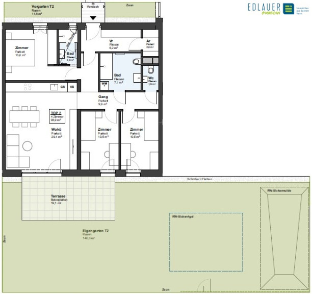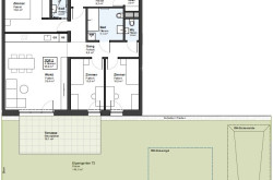Die im Erdgeschoß geplante Wohnung Top 2 (Lift ist vorhanden) mit ca. 93,9 m² Wohnnutzfläche, einer Terrasse mit ca. 19,1 m² und einem Garten mit ca. 162,6 m² verfügt über folgende Raumaufteilung: