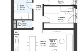 Die im 1. Obergeschoß geplante Wohnung Top 7 (Lift ist vorhanden) mit ca. 71,8 m² Wohnnutzfläche und einem Balkon mit ca. 5,7 m² verfügt über folgende Raumaufteilung:
