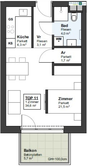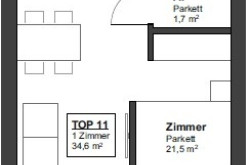 Die im 1. Obergeschoß geplante Wohnung Top 11 (Lift ist vorhanden) mit ca. 34,6 m² Wohnnutzfläche und einem Balkon mit ca. 5,7 m² verfügt über folgende Raumaufteilung: