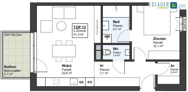 Die im 1. Obergeschoß geplante Wohnung Top 13 (Lift ist vorhanden) mit ca. 51,0 m² Wohnnutzfläche und einem Balkon mit ca. 5,7 m² verfügt über folgende Raumaufteilung: