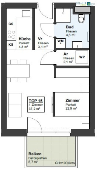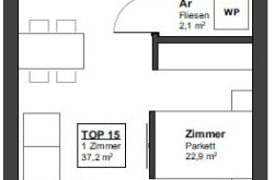 Die im Dachgeschoß geplante Wohnung Top 15 (Lift ist vorhanden) mit ca. 37,2 m² Wohnnutzfläche und einem Balkon mit ca. 5,7 m² verfügt über folgende Raumaufteilung: