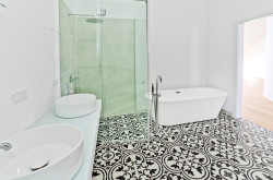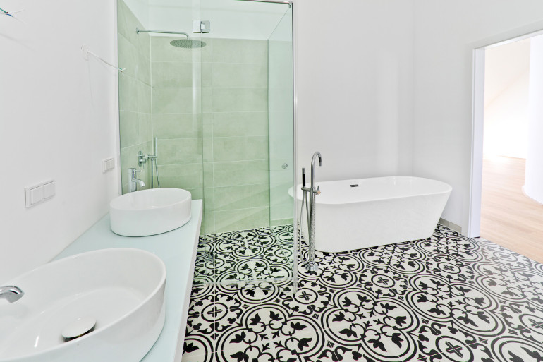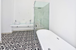 Parkett, Fußbodenheizung, Westbalkon, Badewanne, Dusche