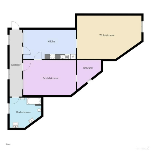 Über einen separaten Gang gelangt man in den Vorraum, von dem man die große Wohnküche und das Schlafzimmer mit Schrankraum und das Badezimmer (mit Wanne, WC, Fenster und Waschmaschinenanschluss) betritt. Durch die Wohnküche hindurch, gelangt man in das 2. große Zimmer. Ein Büroaufwand in der Höhe von 1x Euro 160,- ist an die Hausverwaltung zu bezahlen. Der Vermieter verlangt eine Einkommensnachweis (Lohnzettel 2 Monate) und /oder einen Bürgen und Zahler.