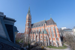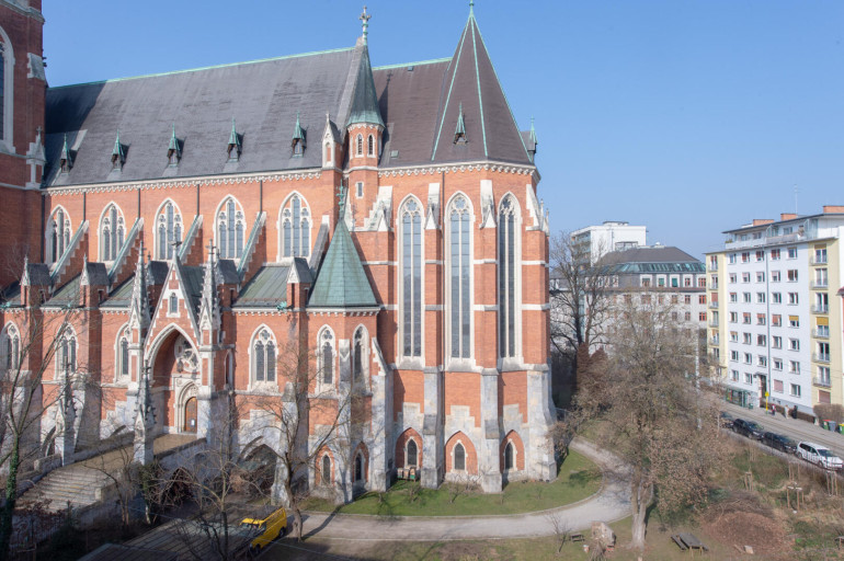 - Hofseitiger Balkon mit Blick auf den weitläufigen Innenhof und die Herz-Jesu-Kirche – Ruhe mitten in der Stadt