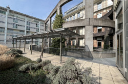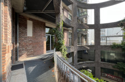 Zugang zum begrünten Terrasse mit Ausblick in den begrünten Innenhof