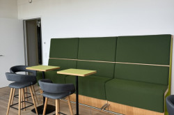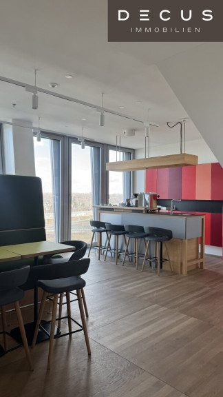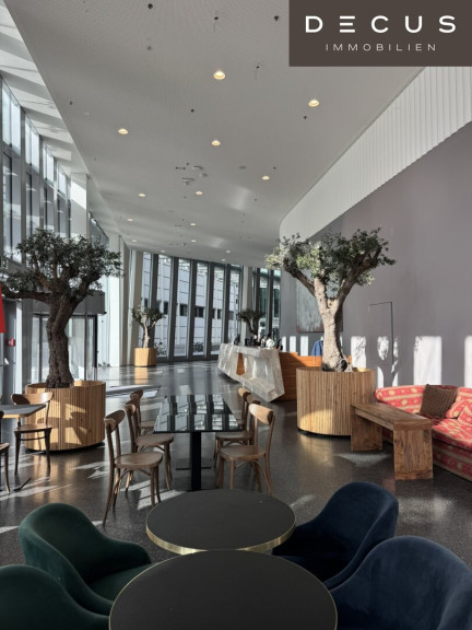 Ein besonderes Augenmerk wurde auf Servicequalität und Aufenthaltskomfort gelegt. Im Erdgeschoss befindet sich eine attraktive gastronomische Nutzung mit Café und Außenbereich vorgesehen, die sowohl Mitarbeitern als auch Besuchern als kommunikativer Treffpunkt dient. Ergänzend steht im ersten Obergeschoss ein hochwertiges Betriebsrestaurant zur Verfügung. Ein professioneller Empfangs- und Portierservice gewährleistet rund um die Uhr Betreuung und Sicherheit im Gebäude.