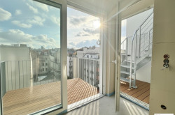 Mit dem Personenlift gelangt man direkt in den Eingangsbereich des exklusiven Penthouses. Über den Vorraum mit angeschlossener Gästetoilette betritt man den großzügig angelegten, nordsüdseitig ausgerichteten Wohn-Ess-Bereich mit ca. 72,00 m² Wohnfläche sowie einen südseitig gelegenen Balkon und eine kleine Terrasse, die den Aufgang zur ca. 43,00 m² großen Dachterrasse mit traumhaftem Panoramablick bietet. Weiters kann eines der drei Schlafzimmer mit ca. 14,00 m² direkt vom Wohn-Ess-Bereich aus begangen werden.