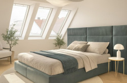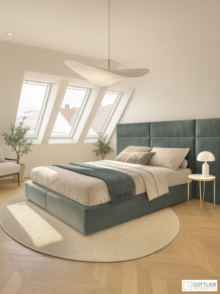 Über einen Gang erreicht man den Abstellraum, das Tageslichtbad mit Badewanne und Waschbecken, den nordseitig gelegenen Master-Bedroom mit ca. 18,00 m², das Bad - ausgestattet mit Dusche, Waschbecken und Toilette - sowie ein weiteres, südseitig ausgerichtetes Schlafzimmer mit ca. 16,00 m² und privatem Balkon.