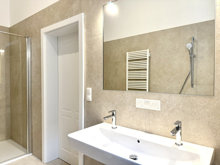 Das Badezimmer überzeugt durch seine Größe und hochwertige Ausführung: Es verfügt über eine Badewanne, eine separate Dusche, ein Doppelwaschbecken sowie ein Fenster für natürliches Tageslicht und optimale Belüftung.