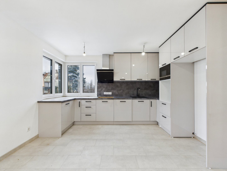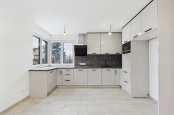 Großflächige REKORD-Fenster im weiß-anthrazitfarbenen Design lassen viel Tageslicht in den Raum und unterstreichen die moderne Architektur. Der Kochbereich ist am Ende des Raumes positioniert und fügt sich ruhig in das offene Raumkonzept ein. Die bereits eingebaute Küche ist im Kaufpreis inkludiert und harmonisch auf das Gesamtbild abgestimmt. Dadurch bleibt der Wohnbereich offen und flexibel nutzbar – ideal für Wohnen, Essen und Entspannen.